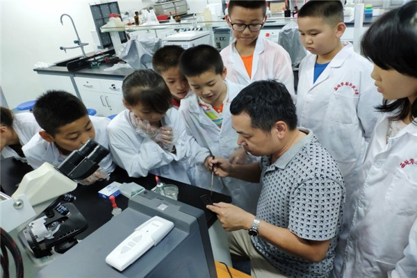 前期准备时,队员们邀请魏新元副教授为小朋友讲解微生物方面的知识,魏新元副教授用幽默风趣的语言将原本抽象难懂的专业知识讲得十分有趣。魏新元教授这样给小朋友形容不同放大倍数下的细菌个体:“放大倍数低的和放大倍数高的就是潘长江和姚明的区别”。“你们现在看不到这些细菌,但是放大倍数高的时候他们就是一个集团军,数量多的很”。讲解完理论知识后,魏新元副教授亲自为小朋友展示实验室是如何取菌、染色、如何使用显微镜观察等基本实验操作,整个过程小朋友都目不转睛地盯着老师的每一步操作,生怕错过每一个小细节。