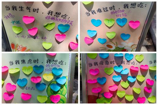 随后,同学们在展板相应板块,在便签纸上写下自己在疲惫、焦虑、难过和生气时最想吃的食物种类。一张张小小的便签纸,承载着同学们对情绪与食物关联的独特感悟,也成为了大家交流分享情感体验的窗口。