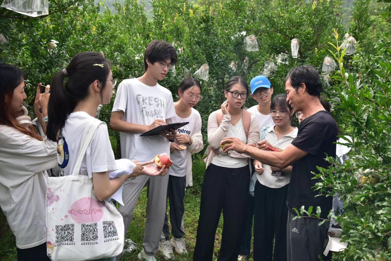 实地考察石榴种植园,深入思考发展之出路。在实习期间,“食韵榴香”团队还围绕石榴产业在乡村振兴中的作用进行了专题调研。天刚蒙蒙亮,团队成员在果农杨叔的带领下翻越沟沟壑壑来到石榴种植园地,根据果农杨叔描述:家里种有七亩地的石榴,石榴养护成本高,需要农户精心料理。石榴浑身都是宝,种植石榴给当地的农户带来了一笔可观的收入。通过实地走访农户、收集数据、分析案例,团队成员们对石榴产业如何带动当地农民增收、促进农业提质增效等问题有了更全面的了解,并形成了初步的调研报告。