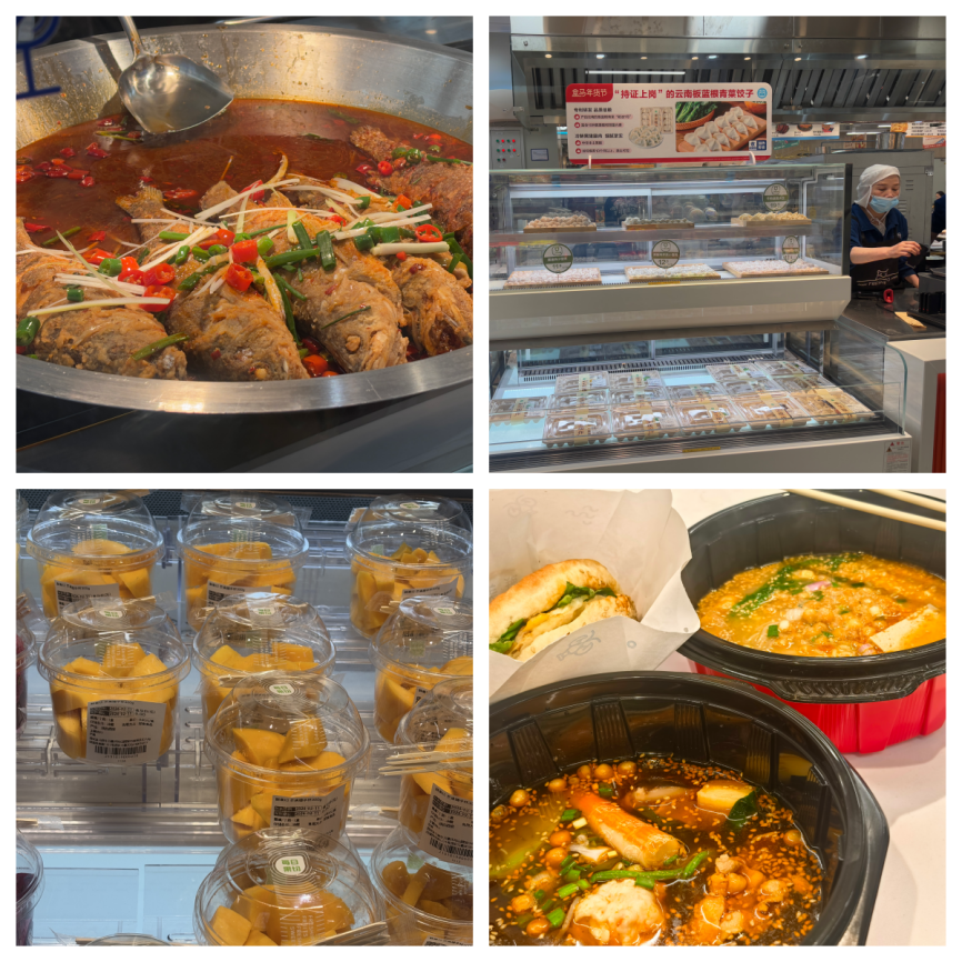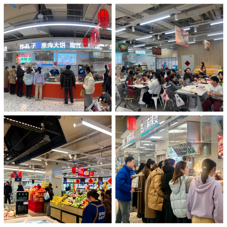 除了硬核的科技应用,调研团队还关注到了新零售模式下的人文关怀与服务细节。从入口处贴心设置的宠物寄存区,到出口便民服务站摆放的皮筋、护手霜等小物件,处处都体现着“以人为本”的服务理念。特别是现场加工区与试吃服务,将单一的购物场景打造成了充满烟火气的体验空间,让消费者在购物的同时还能享受美食体验,有效拉近了品牌与消费者之间的距离。在随机访谈中,多位消费者分享了自己的感受:一位拎着满满购物袋的阿姨笑着说:“我现在买菜经常来这儿,能看到菜的产地和采摘时间,吃着特别放心,而且还有试吃,能先尝再买,特别贴心”;另一位年轻的上班族则表示:“平时下班晚,没时间做饭,来这儿买了海鲜直接就能现场加工,当作晚餐特别方便,这种购物加餐饮的模式太适合我们了”。