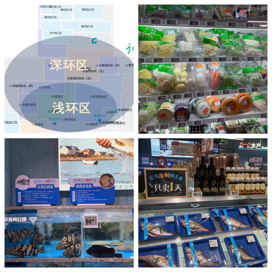 调研伊始,团队并未采用传统的参观模式,而是提前做好了充分准备,调研成员将门店布局图提前打印并进行标注分区,对卖场的空间动线展开了细致的分析。团队成员围站在门店入口处,对照着布局图,逐一记录顾客的行走路径,时不时低声交流着各区域的客流特点。他们观察发现,门店的区域规划暗藏着严谨的消费心理学逻辑:盒马鲜生品牌的“招牌”水产、生鲜肉禽等引流品被设置在卖场深处的“深环区”,作为顾客购买驱动力,有效引导顾客打开钱包入店选购;而日常蔬果及日用品则分布在“浅环区”,通过延长消费动线增加了顾客的在店停留时间,激励消费者购买更多商品。在半成品区域,团队还留意到了“关联陈列”策略的巧妙运用——海鲜产品旁精准搭配了专用调味料,这种围绕消费场景进行的商品重构,不仅解决了消费者“买了食材不知道怎么做”的痛点,也展现了精细化运营在提升消费连带率方面的实际效果。