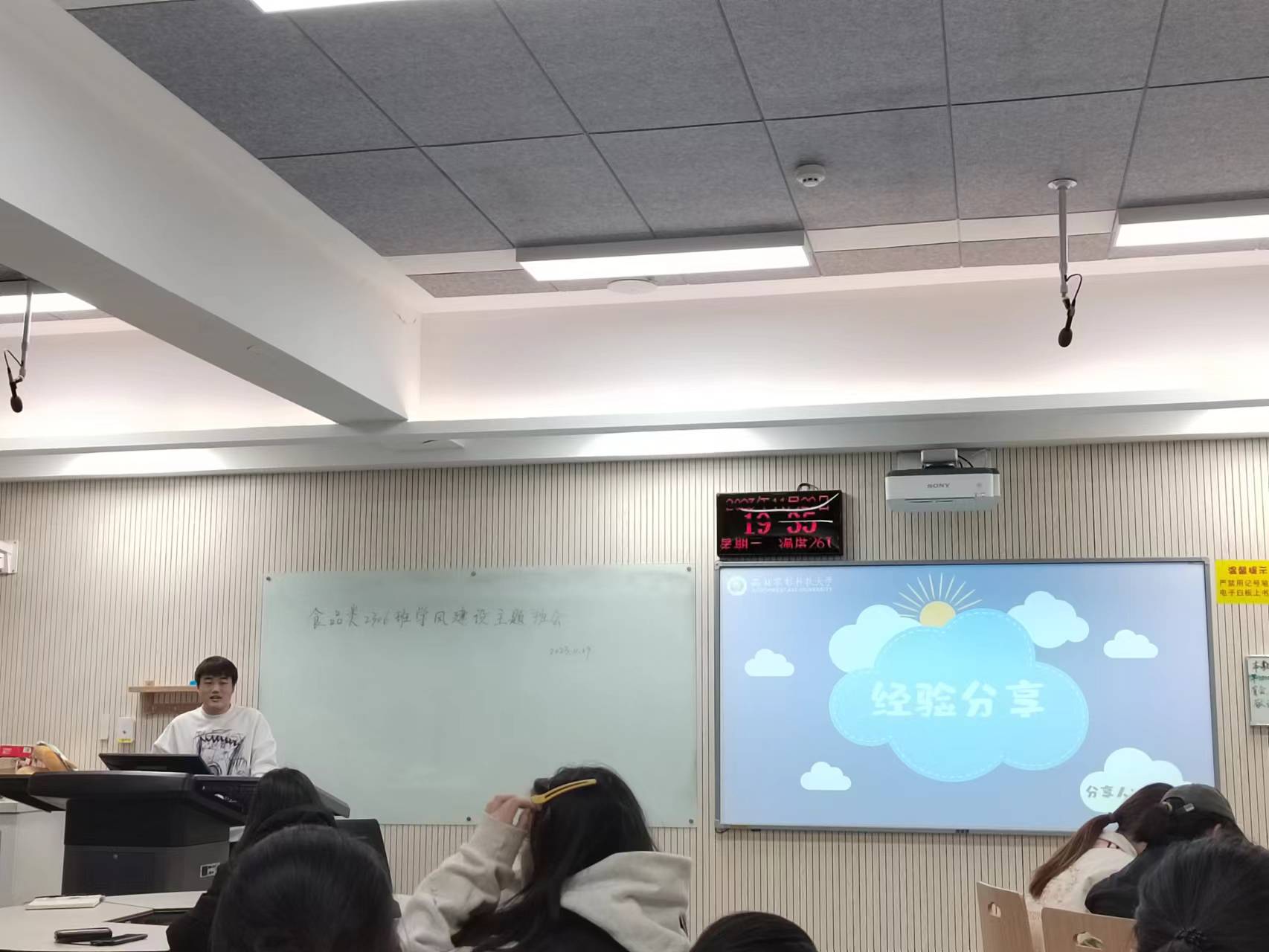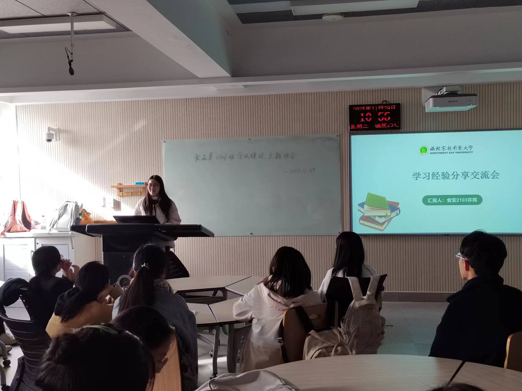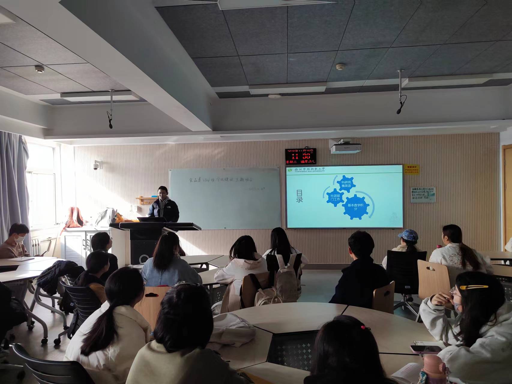 为了切实加强班级学风建设,有效解决同学们学习态度不端、方法失当等问题,明确学习方向与目标,激发主动学习状态,食品类2306班于11月29日上午10:00-12:00及下午19:00-21:00在N8809召开专业思想再教育暨学习经验交流会,本次会议邀请了王云阳副经理、食品科技系系主任杜双奎教授以及学习经验交流会宣讲团优秀代表许苑、张家豪、郭家辉、王海慧出席。会议准备阶段,班长李凯茵介绍了参会的公司领导及宣讲团成员,对他们的到来表示热烈欢迎和衷心的感谢。