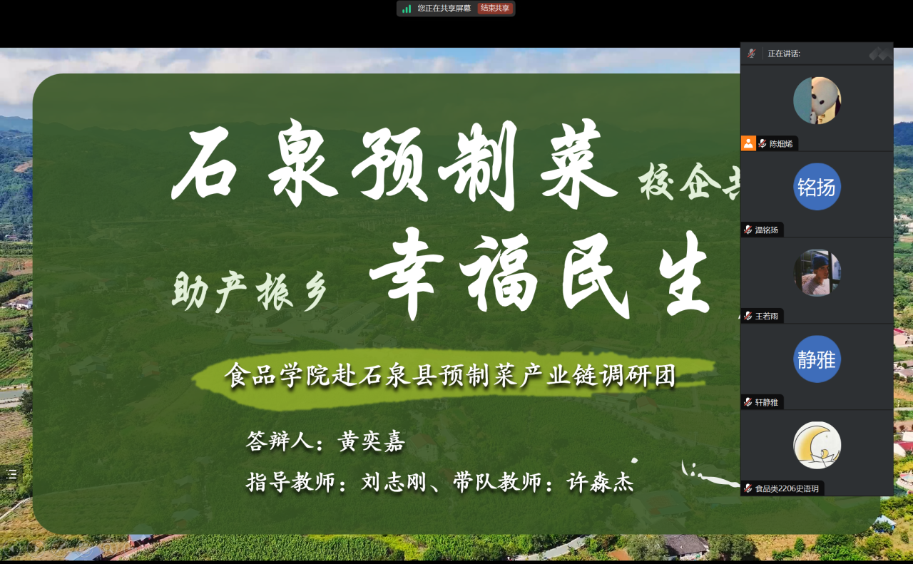 7月11日,食工2203班在线上腾讯会议举办了以“走进乡村,助力振兴”为主题的社会实践经验分享交流会。本次活动由班长黄奕嘉担任主讲人,旨在通过分享其在石泉县参与预制菜项目校企合作的亲身经历,激发同学们的社会责任感与创新精神,同时探索乡村振兴与产教融合的新路径。