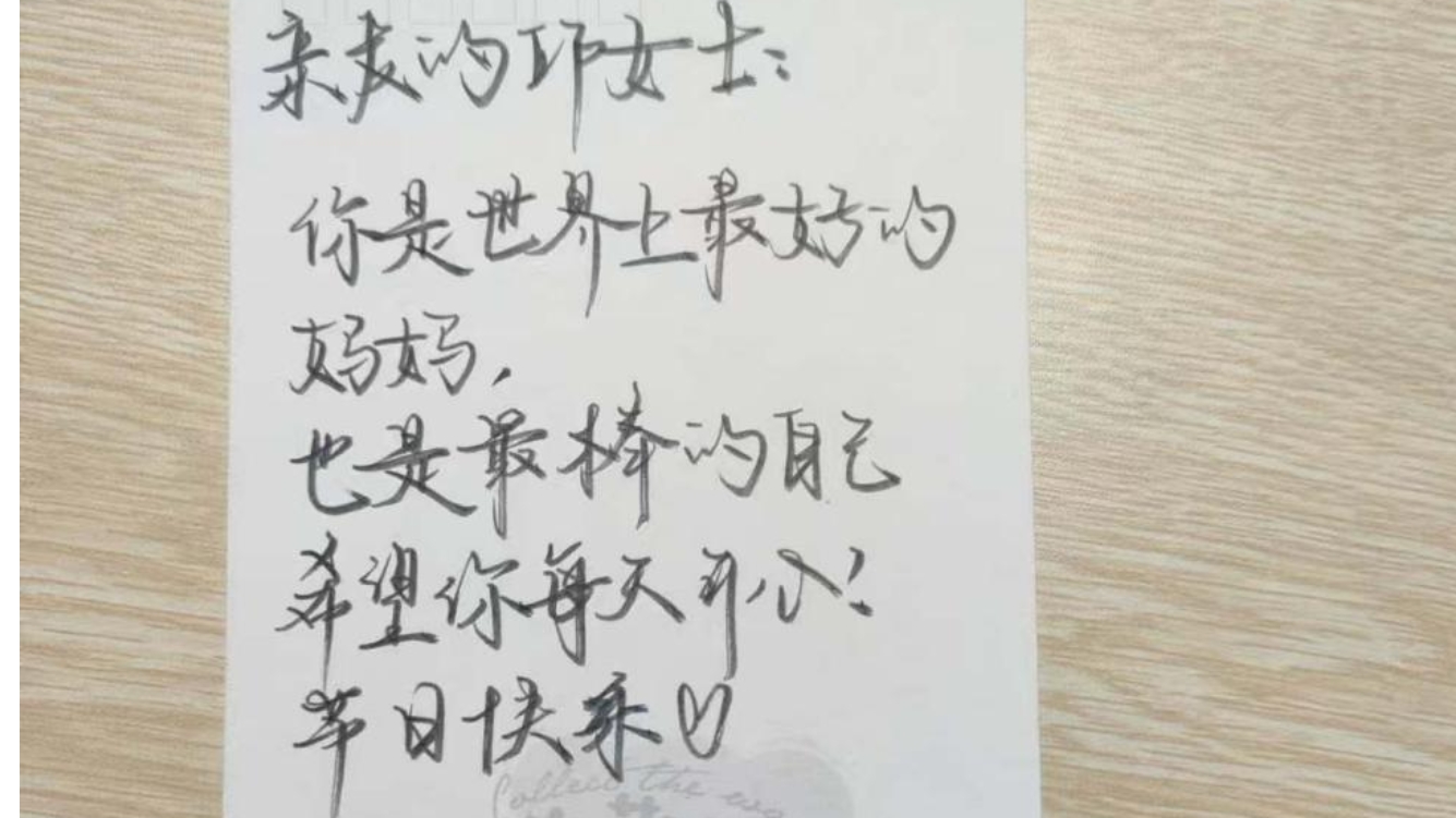 活动中,同学们用心设计贺卡,将对母亲的深情融入其中。杨语晨同学在贺卡中写道:"你是世界上最好的妈妈,也是最棒的自己,希望你每天开心,节日快乐!"她的祝福不仅表达了对母亲的感恩,也展现了女性在家庭和社会中的双重价值。其他同学也纷纷通过文字和手绘,传递对母亲的敬意与爱意。