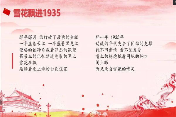 本次决赛以小组形式进行,共有八支队伍参赛,各参赛队伍围绕“纪念一二九,传承爱国情”主题进行宣讲,各参赛队伍通过图片,视频结合演讲、演唱、朗诵等形式以深厚的人文知识功底、出众的口才演说和敏捷的现场应变能力为现场观众献上了一台精彩万分的视听盛宴。
