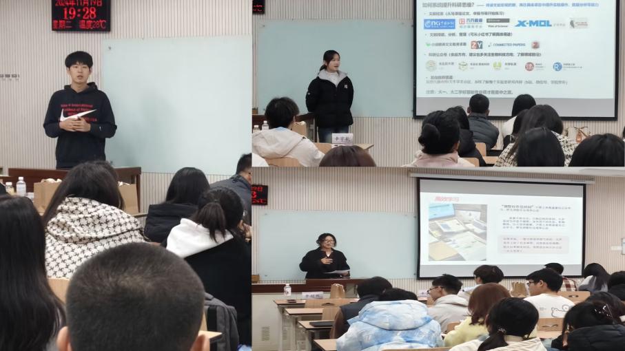 在经验分享环节,“食”代先锋工作坊成员相继发言。辛宇航向同学们介绍了遴选的基本条件和专业基本课程相关内容,为有志向的同学提供了宝贵信息。何佩芸针对科研思维提升这一主题进行分享,详细讲解了提升科研思维的方法和途径,并介绍了“三下乡”活动,让同学们对科研实践有了更全面的认识。李超然针对如何高效学习给出了参考方案并讲解了期末复习技巧。