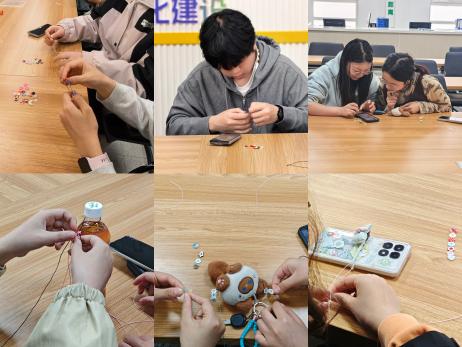 学习环节结束后,同学们挑选心仪纽扣与彩线,发挥创意搭配组合,开始了实操环节。面对编绳、穿扣等实操难题,大家互助协作、共同探讨,在动手实践中精进技能、感受传统手作魅力。沉浸式的手作过程,让同学们暂时放下学业压力,在专注与创造中放松身心、舒缓情绪。
