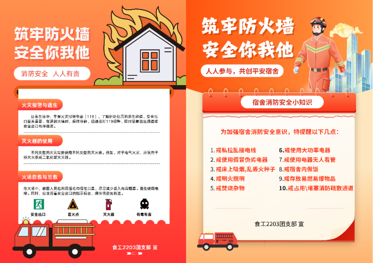为普及消防安全知识,加深员工对火灾预防、初期处置及逃生自救方法意志,食工2203团支部于11月开展了“火警无声,安防有心”的主题团日活动。团支部通过多元化的教育实践活动,包括创意海报展示、消防演练视频观看及宿舍逃生演练等共同为构建安全和谐的校园环境贡献力量。