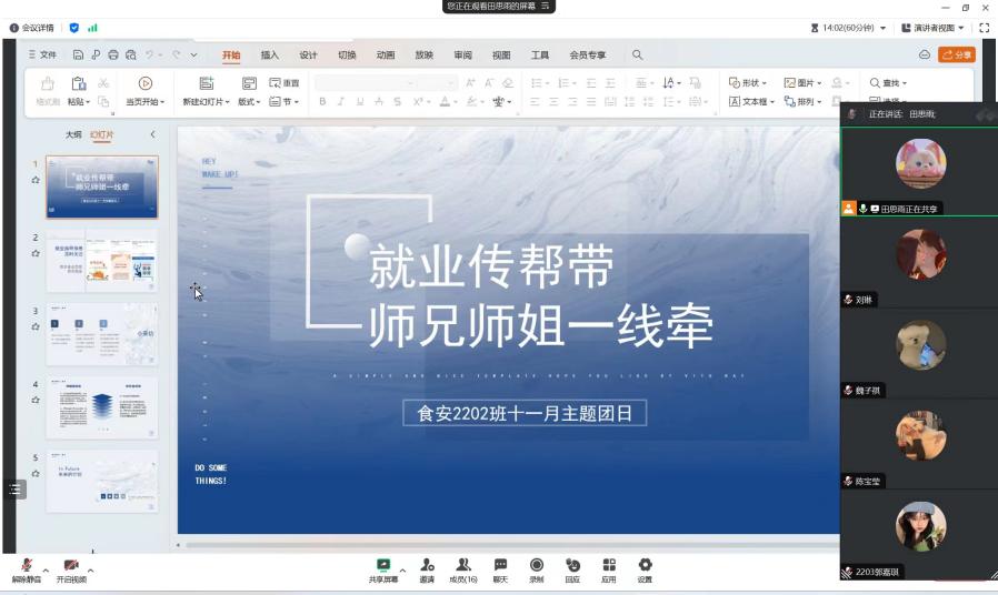 2023年11月17日晚上九点,365上市集团官网食安2202团支部成功举办了一场以“就业传帮带,师兄师姐一线牵”为主题的主题团日活动。本次活动旨在帮助同学们了解就业形势,提升就业技能,为建设优良学风示范班做好准备,同时通过师兄师姐的分享,让同学们在求职路上少走弯路。