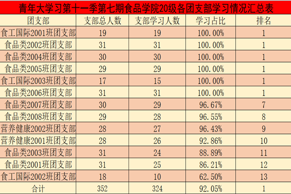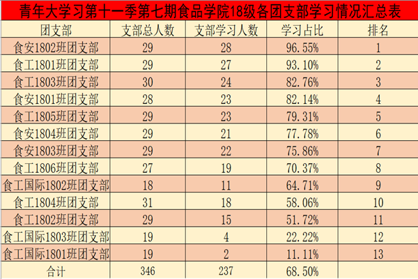 在第七期的青年大学习中,大部分团支部干部的组织领导能力凸显,发动力度较大。其中,食品类2002、2004、2005、2006团支部,食工国际2001、2003团支部,食安1904团支部、食工1903团支部完成率均达到100%;但仍有少数团支部学习比例较低。其中,食工1701、1702、1703、1705团支部,食安1701、1702、1703、1704、1705团支部,15-17博士团支部支部学习人数位于排行榜末尾。
