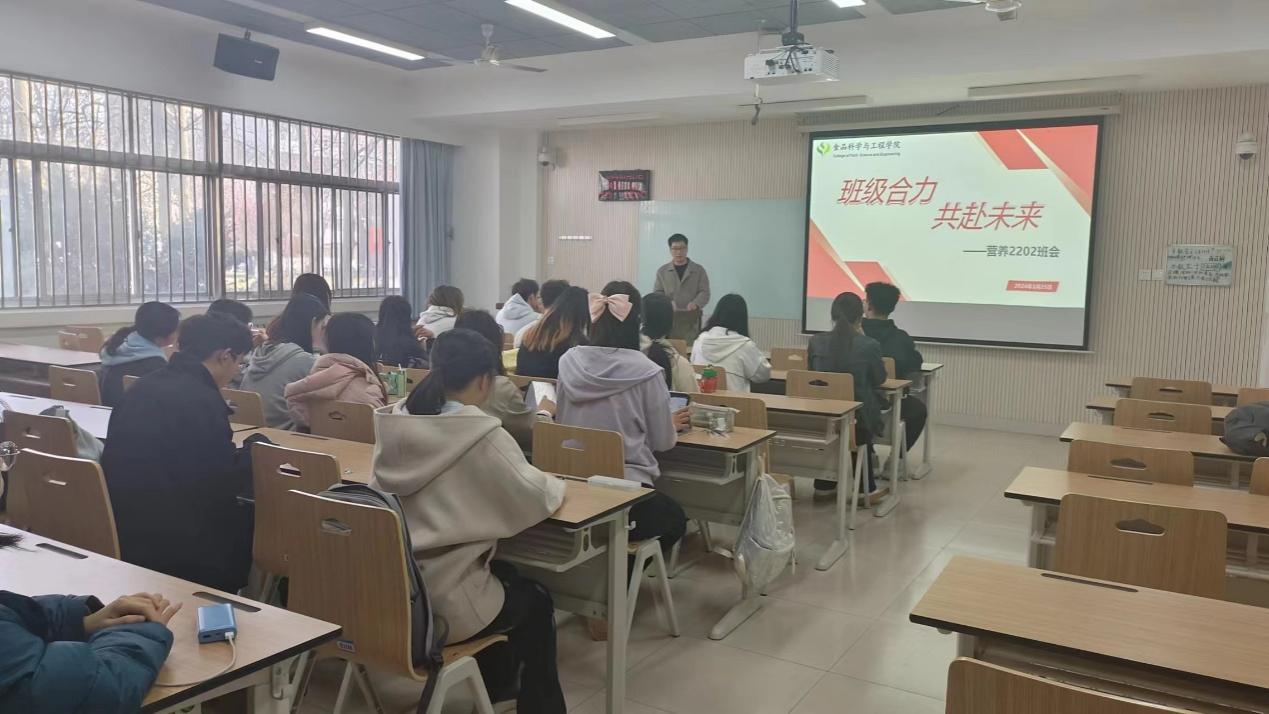 寒气消弭,沐浴春风,伴随春天的到来,不知不觉间,同学们的老员工涯即将过半,在大二下学期这个关键的时间节点,为了确保本学期工作方向明确,让同学们明确本学期的一些安排和活动,帮助同学们早日做好未来规划,激发同学们的工作学习热情,营养2202班于2024年3月25日上午在N8108教室开展了本学期的第一次班会,营养2202班班主任何财安老师和班级全体同学参与了此次班会。