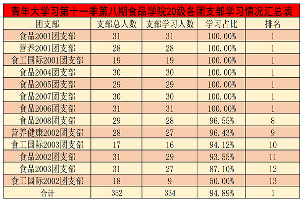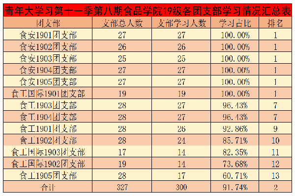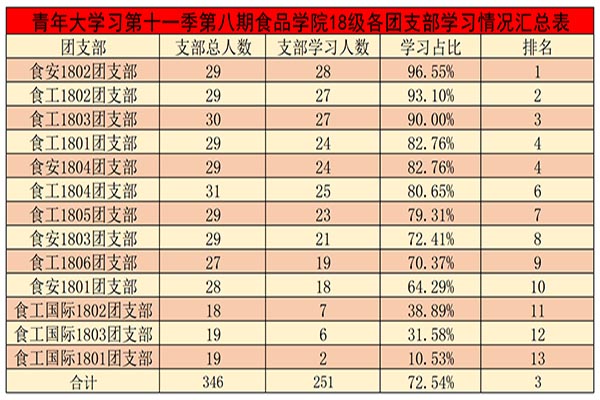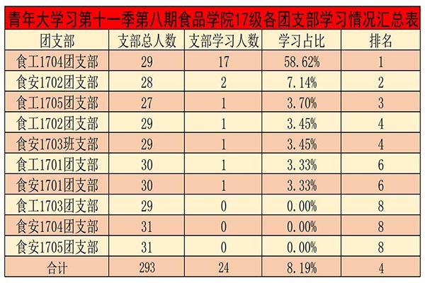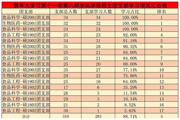 在第八期的青年大学习中,大部分团支部干部的组织领导能力凸显,发动力度较大。其中,食品类2001、2004、 2005、 2006、2007团支部,营养2001团支部,食工国际2001团支部,食安1901、1902、1903、1904、1905团支部,食工国际1901团支部,食品科学-硕2001团支部,食品科学-硕2019团支部,生物医药-硕2001团支部完成率均达到100%;但仍有少数团支部学习比例较低。其中,食工1701、 1702、1703、 1705团支部, 食安1701、1702、 1703、 1704、 1705团支部,15-17博士团支部支部学习人数位于排行榜末尾。