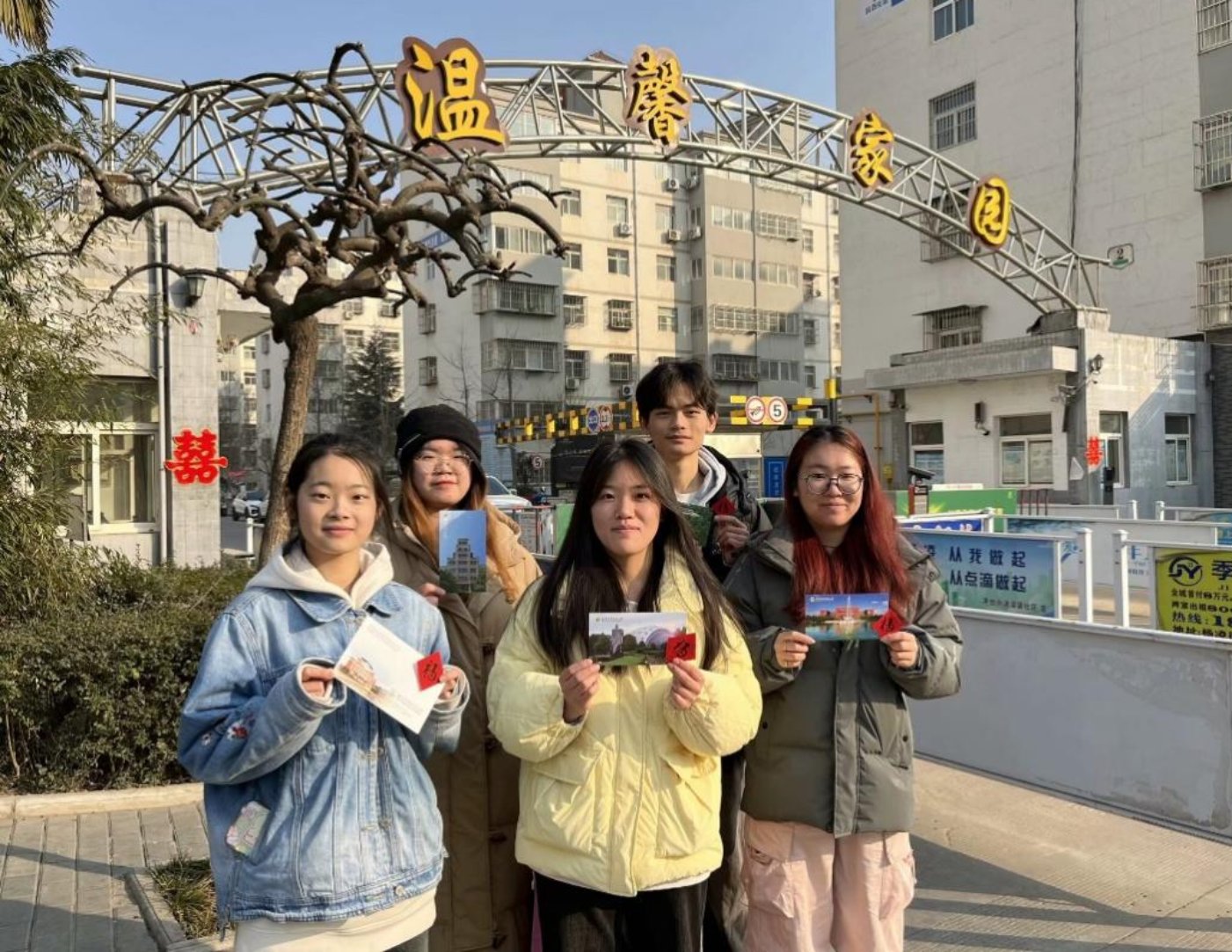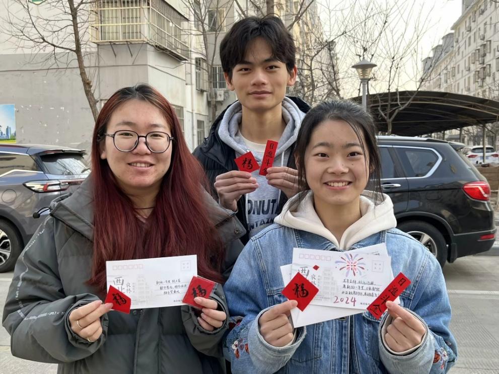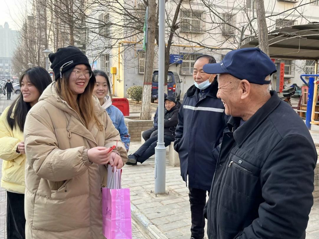 到达社区后,首先由韩明月女士带领村助们进入社区。在韩女士的引导下,村助们开始尝试与社区居民进行交流。在交流中发现社区的爷爷奶奶们都十分和蔼可亲,对于村助们的到来也表现出了极大的热情和欢迎。村助们与居民们聊起了家常,询问他们的日常生活、健康状况以及对社区的看法和建议。在与居民的交流中,村助们深刻感受到了他们的淳朴和善良。同时村助们也为居民们送上了新春祝福以及新年贺卡,既向居民们传达了关心和祝福,更是传达了希望他们在新的一年里能够过上美好生活的祝愿。