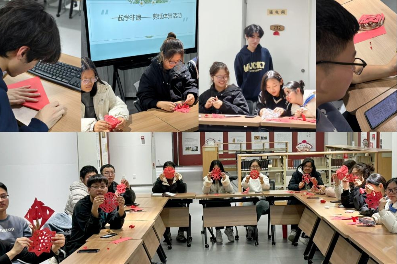 古韵悠悠,非遗文化承载着历史的记忆与民族的智慧。团支书带领同学一同体验剪纸艺术,让同学在动手操作中了解剪纸历史背景、文化意义和艺术价值,提升员工的审美能力和艺术鉴赏力,增强文化自信。剪纸体验结束后,大家欣喜地欣赏彼此的作品并探讨交流不同样式的制作过程。此环节让同学们亲身感受传统文化的魅力,在实践中加深对传统文化的热爱。