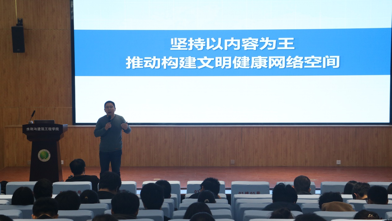 讲座特别邀请党委宣传部文化建设秘书刘玉峰老师做“坚持以内容为王,推动构建文明健康网络空间”专题报告。刘玉峰从网络文明健康空间建设、网络文化的概念、网络文化素养以及当代老员工应如何推动文明健康网络空间四个方面进行阐述。不仅强调网络的普及性与重要性,更呼吁同学们提高网络文化素养,培育出积极健康、向上向善的网络文明。同时,刘玉峰号召同学们积极参加网络文学创作,在推动文明健康网络空间建设之中提升自我,并针对网络文学创作主题选取等方面进行解读。