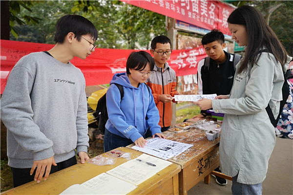活动当天,工作人员提前到达西区雕塑处,布置活动现场。上午9点30分,活动正式开展,同学们积极捐赠书籍,并在横幅上留下自己的姓名,写下自己对孩子们的心意,工作人员对捐赠者进行信息登记以及礼品发放,并对无法到达活动现场进行捐赠的同学提供上门取书的服务。同学们似火的热情温暖了深秋,孟令奎同学表示:“捐的旧书不是因为自己看过,而是想把好书带给石门坪村的孩子们。”从小说到杂志,从《论语》到《偷影子的人》,每一本书都凝结着同学们的关怀,传递着深切的爱意。