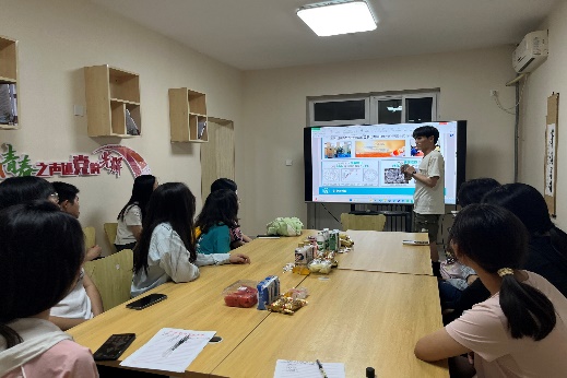会议伊始,鲍炳昆学长先向大家介绍了竞赛的相关内容,帮助大家了解各项竞赛。随后鲍学长以自己参加挑战杯竞赛的PPT为例,讲述该PPT的几个组成部分,旨在让同学们熟悉竞赛的大致流程。学长指出,参赛前首先应该确定选题,并对选题做出全面的背景介绍。随后进行市场调研,找出问题所在,针对问题设计产品。接着进行产品的优势分析,突出自身技术亮点。通过列举典型案例,分析产品为企业和社会带来的效益。最后对团队成员和指导教师做简单介绍,指出未来发展规划。
