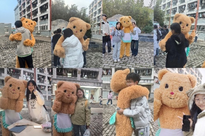 活动开始前,筹办团队用醒目的主题展板吸引同学,工作人员扮演的小熊玩偶也主动为每一位前来的同学送上暖心的拥抱。活动过程中,同学们对小熊玩偶的出现感到十分惊喜,争相与之拥抱、合影。他们纷纷将写满心声的便签贴在展板上,与大家分享自己的感悟、祝福与愿望。同时,一站式员工社区也为参与活动的同学准备了暖宝宝作为礼物,以此传递温暖。
