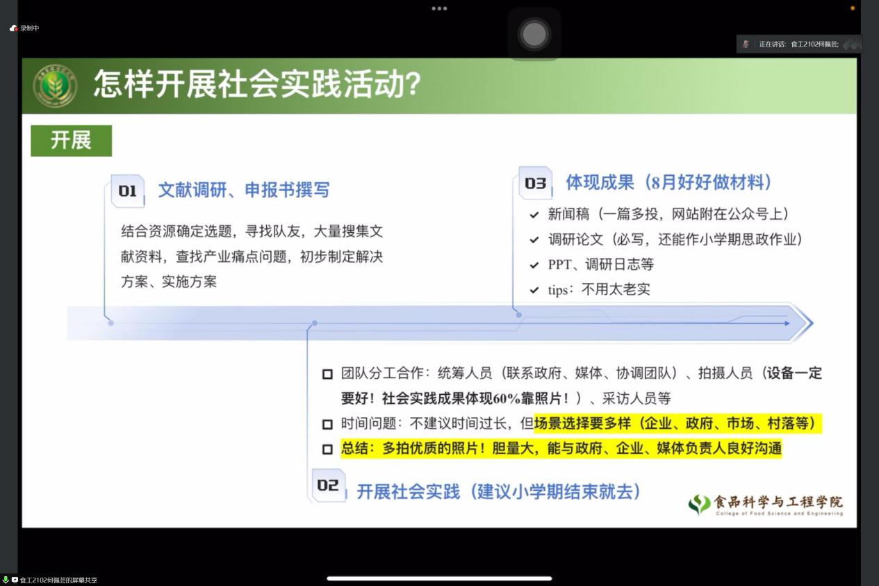 2024年7月1日下午,营养2201班与营养2202班联合举办了社会实践宣讲会,由营养2201班班长李超然担任会议的主持人,何佩芸学姐作为实践模范受邀参与本次会议。旨在帮助同学们更好地理解社会实践的重要性,以及如何开展和取得社会实践活动的成绩。