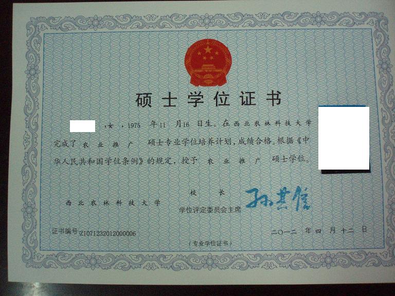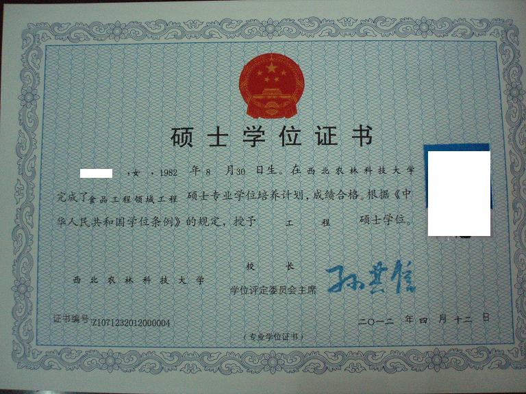 食品加工与安全领域农业推广硕士学位证样照