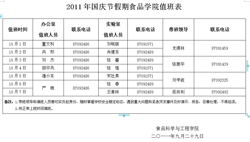 各位师生: 根据《国务院办公厅关于2011年部分节假日安排的通知》精神,现就公司国庆节有关工作安排如下: 一、10月1日至7日放假调休,共7天。10月8日(星期六)、10月9日(星期日)正常上课、上班。本科生10月8日按10月1日课表上课,10月9日按10月2日课表上课。研究生按正常课表上课。 二、从10月1日起,执行冬季作息时间。(见附件) 三、公司值班表|
