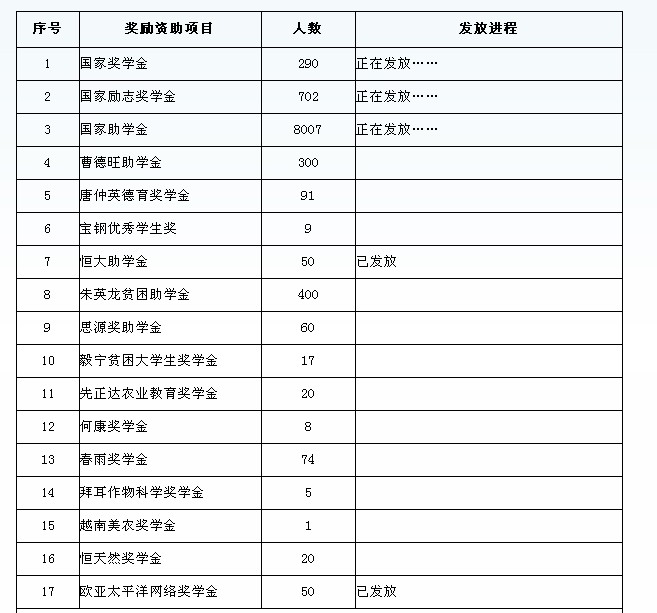 备注: ★ 各项奖助学金暂不充抵员工所欠学宿费,请收到奖助学金的同学自觉缴纳欠费。 ★ 如果员工未能收到奖助学金,解决办法如下: 1、员工首先到所在院系核对学号、帐号等信息,如果登记学号有误,即各项奖助学金已发到目前登记学号对应的员工帐户,需各院系辅导员老师协调处理奖助学金问题。 2、如果是由于员工的账户存在销户、更换、存折满溢等问题未能收到奖助学金,员工持有效证件到中国银行办理发放手续,并到计财处登记新账户信息。