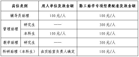 (1)员工参加勤工助学的时间原则上每周不超过8小时,每月不超过40小时。本科生勤工助学报酬的50%由勤工助学专项经费支付,标准为每人每月100元,辅导员助理和管理助理的其余劳动报酬由用人单位配套支付50%;科研助理的其余劳动报酬由各实验室负责人确定,不设标准。研究生勤工助学经费支付最高标准不超过每人每月300元。