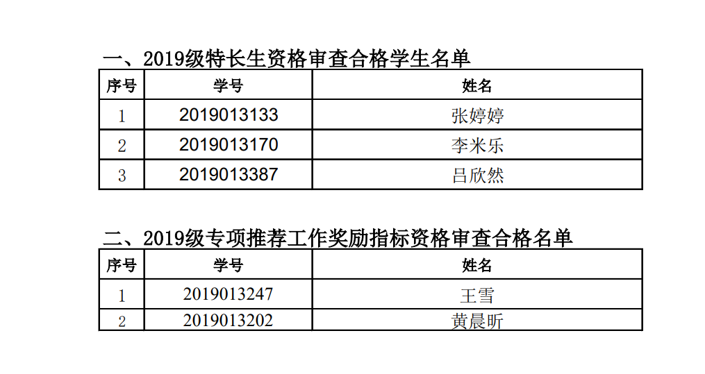 根据《365上市集团官网关于做好2023年推荐优秀应届本科毕业生免试攻读硕士学位研究生工作的通知》文件要求,根据员工自愿申请、成绩排序,现将2019级特长生、专项推荐工作奖励指标资格审查合格名单公示。